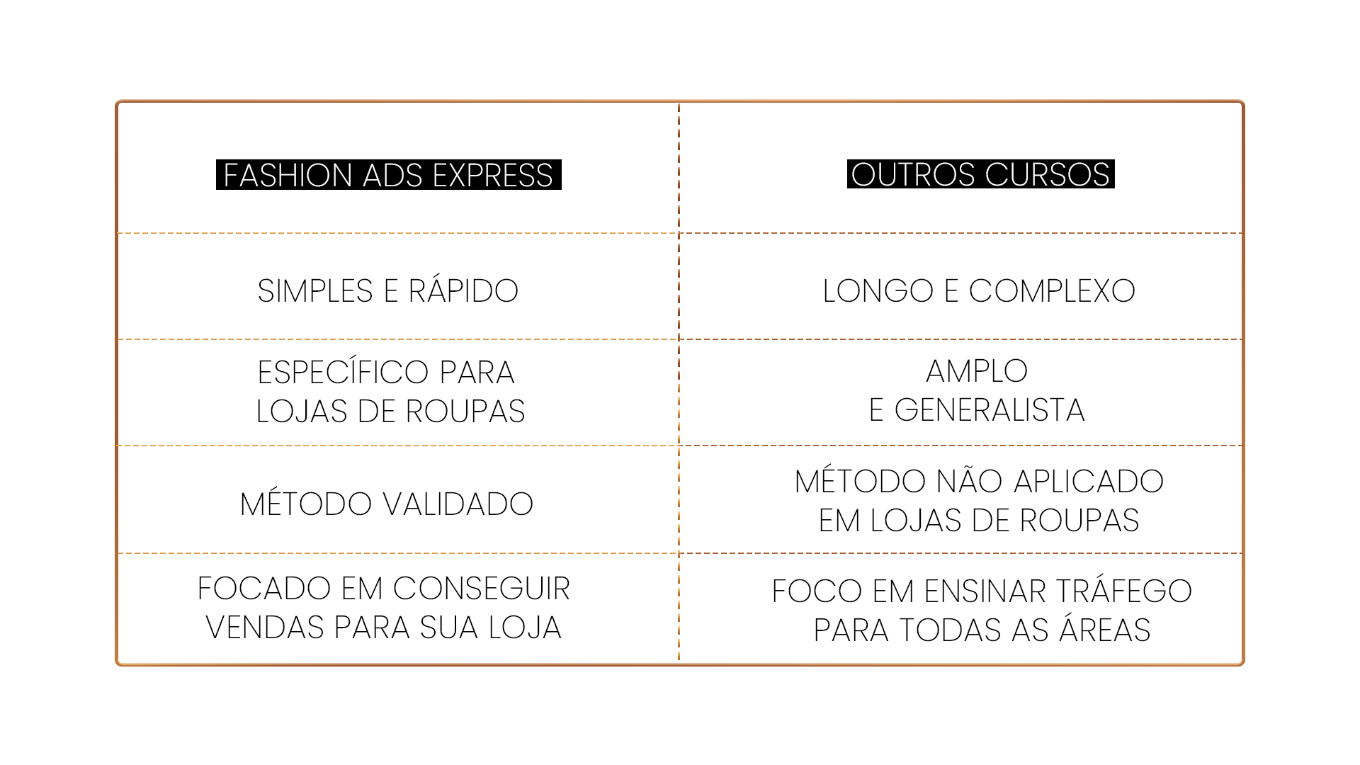 E o melhor de tudo? Você pode começar agora mesmo. Não há necessidade de esperar ou gastar meses planejando e implementando estratégias complexas. Com o Método Fashion Ads Express, você pode começar a ver resultados reais em semanas.
